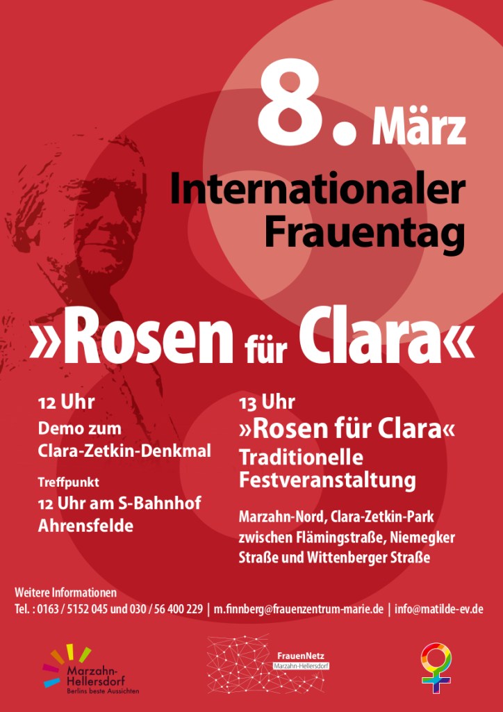 Anlässlich des internationalen Frauentages findet wieder die traditionelle Veranstaltung „Rosen für Clara“ am Clara-Zetkin-Denkmal im Marzahner Norden statt. Das Marzahn-Hellersdorfer Frauennetz hat eingeladen, um gemeinsam der immer noch hoch aktuellen Forderung nach Gleichberechtigung kämpferisch Ausdruck zu verleihen. Auch in diesem Jahr wird wieder eine Demonstration vom S-Bahnhof Ahrensfelde aus durch den Marzahner Kiez hin zum Denkmal für die Frauenrechtlerin und Kommunistin Clara Zetkin führen.