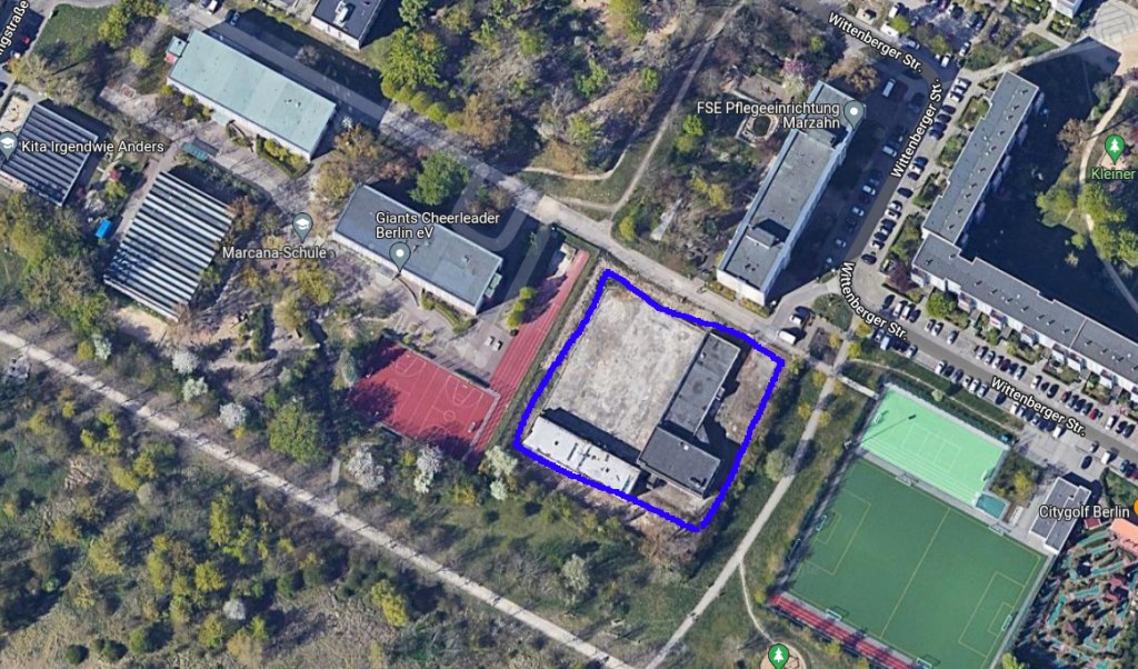Das Grundstück grenzt an die Marcana-Gemeinschaftsschule, den Sportplatz, den Seelgrabenpark und die Wittenberger Straße und beläuft sich auf ca. 6.000qm. Auf dem Grundstück befand sich früher eine private Sportanlage. Nach der Schließung verfielen die Gebäude zunehmend und wurden letztlich nach einem Brand und jahrelangem Lehrstand abgerissen.