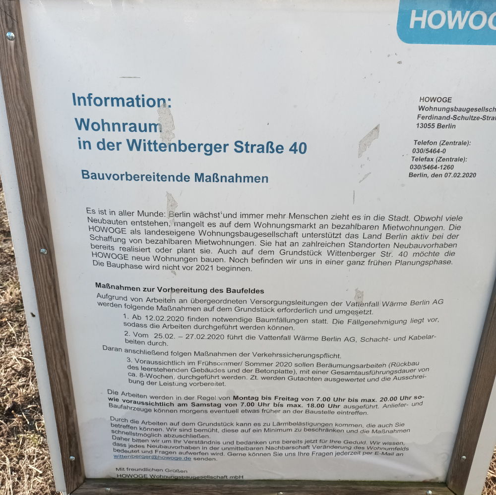 Die landeseigene Wohnungsgesellschaft HOWOGE übernahm das Gelände und beabsichtigt dort den Bau von Wohnungen. Auf einem Schild hat die Gesellschaft über diese Absicht und weitere Schritte informiert.